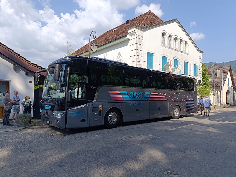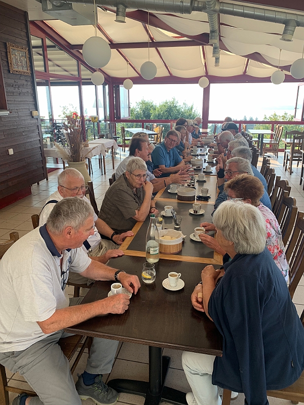 Die Reise beginnt um 08.45 bei der Gast Reise AG in Utzenstorf.. Genüsslich besteigen wir Chörler/innen den bereitstehenden Reisecar und richten uns für die erste Etappe gemütlich ein. Via Autobahn geht’s Richtung Neuenburger-Jura. Nach fast eineinhalb stündiger Fahrt, mit etwelchen Strassenbaustellen, erreichen wir das Restaurant de la Gare in Montmollin. Es ist sehr schön bei perfekter Aussicht auf den Neuenburgersee Kaffee und Gipfeli zu geniessen.