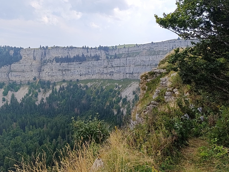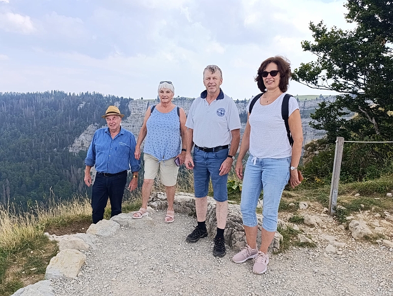 Die Reise führt weiter zur Alp le Soliat (1383 m.ü.M.) die Verspätung (nach der Degustation) hält sich in Grenzen, d.h. ca eine Stunde...ha ha .. Bekanntlich wird ja die Gegend Creux du Van dort als der «Grand Canyon» der Schweiz beschrieben. Steile Felswände ragen tief aus dem Tal herauf, es kann fast Furcht aufkommen. Nach dem Feinen Mittagessen, bestehend aus Salat, Hamme und Kartoffel-Gratin sowie Dessert und Getränke, wagte sich niemand so recht nahe an die Abgründe. Die Fotos beweisen das..